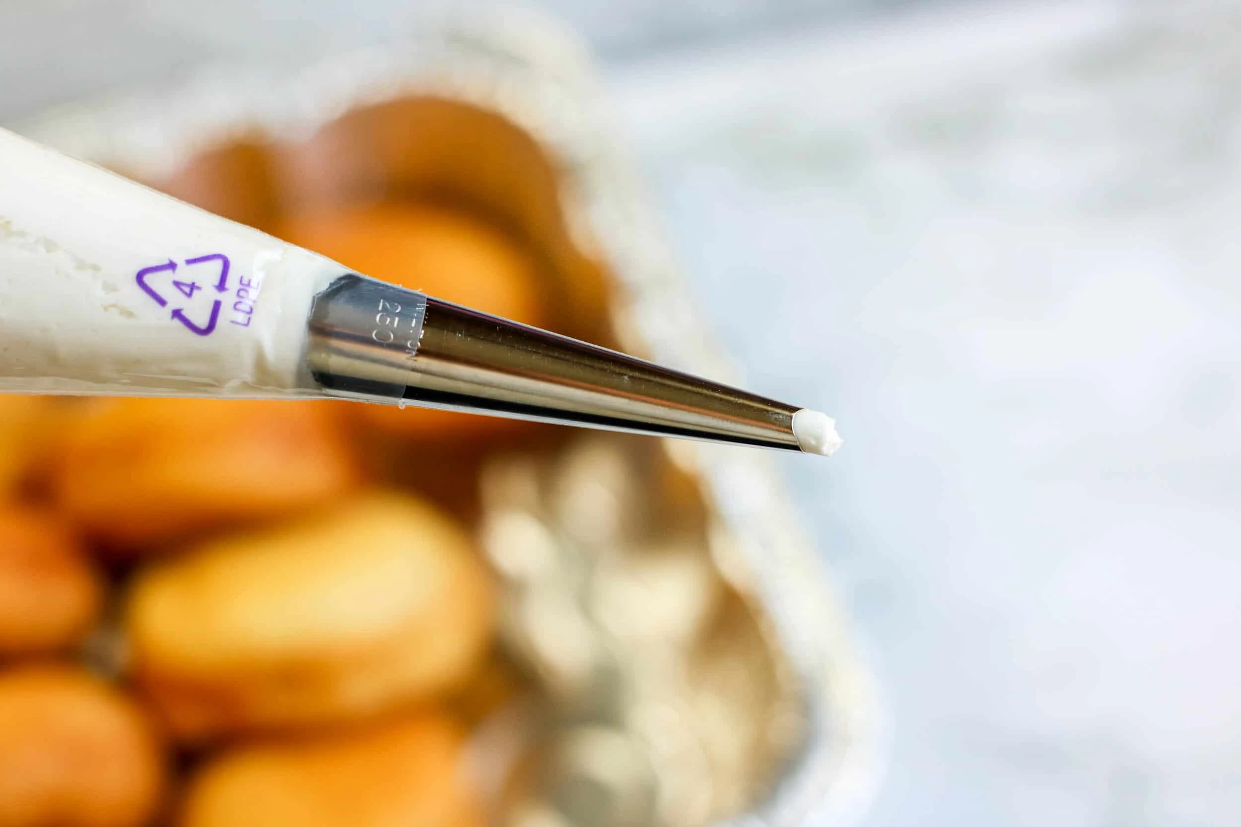 - Place the tip inside the doughnut and press the bag to fill the doughnut. Do not overfill as the doughnut will crack.