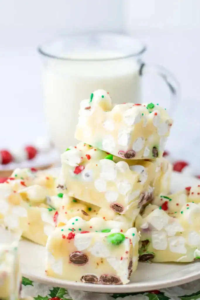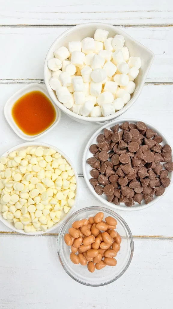 This recipe combines both white chocolate and milk chocolate chips, which blend into a luscious base for all the goodies. The salty crunch of peanuts adds the perfect contrast to the sweetness of the chocolate. The mini marshmallows bring that classic rocky road texture everyone loves. A splash of vanilla ties it all together with a cozy, homemade flavor that evokes nostalgia and festivity.