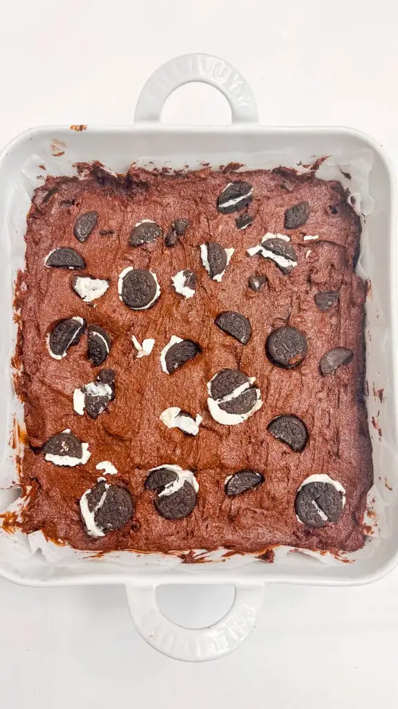- Gently fold in most of the crushed mini Oreos, reserving a handful for the top. Pour the batter into the prepared pan and smooth it out evenly. Sprinkle the remaining Oreo pieces over the top.