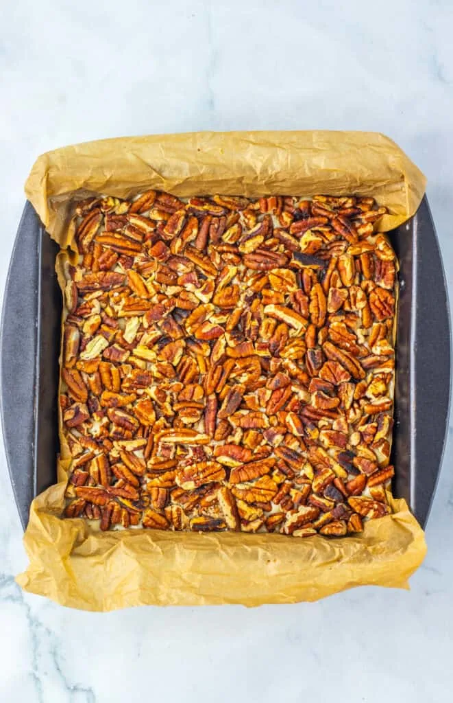 1. Line an 8x8 baking dish with parchment paper and set aside. In a large skillet, toast the pecans over a medium to high heat for 5 minutes or less. Once they are done, set aside to cool.