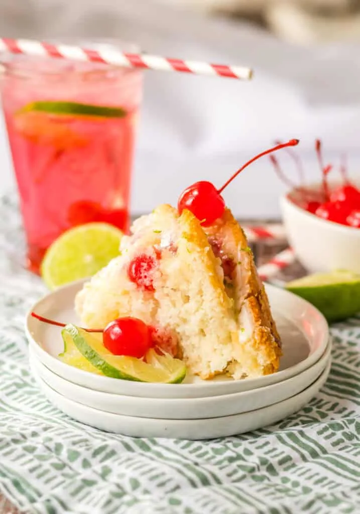 This deliciously simple cake is like a Shirley Temple drink in dessert form! Made with a cake mix and lemon lime soda, cherries are studded throughout this moist cake and a lemon lime glaze and cherries on top finish this stunning and flavorful cake.